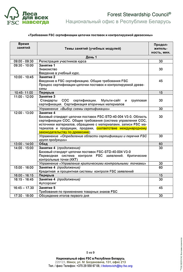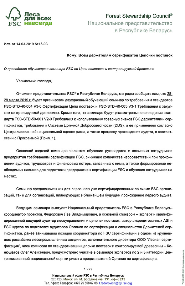 28-29 марта 2019 г. Обучающий семинар FSC по Цепи поставок и контролируемой древесине