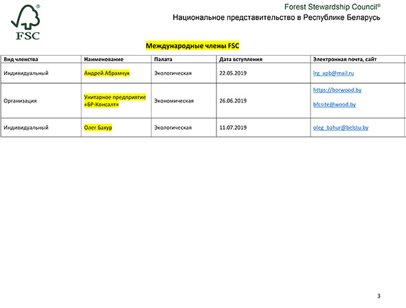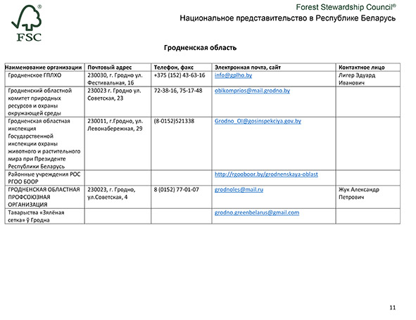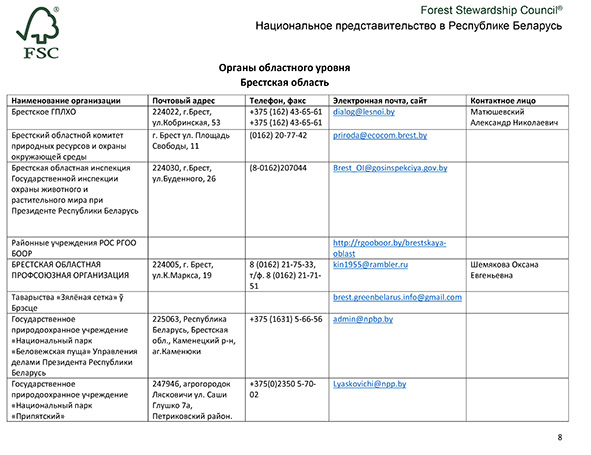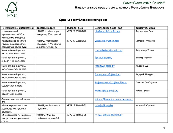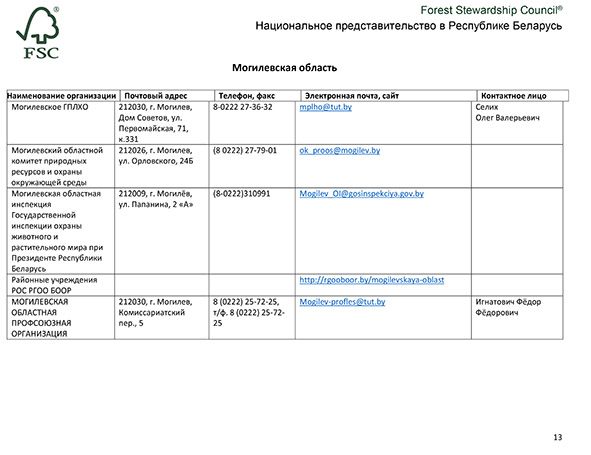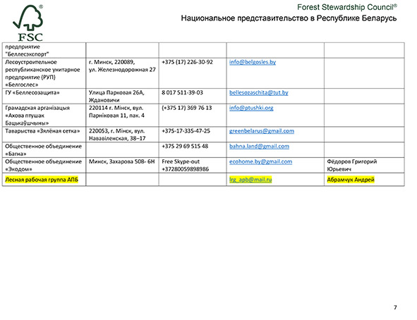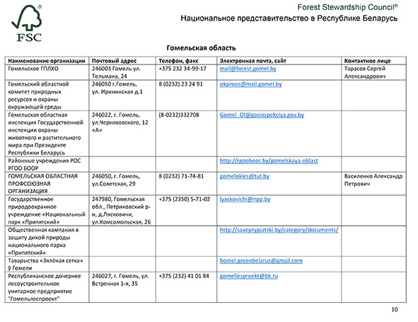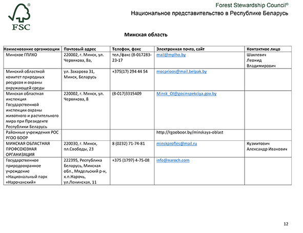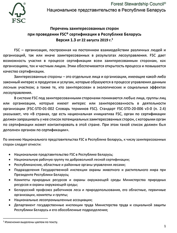 Обновлённый перечень. Заинтересованные стороны при проведении FSC сертификации в Беларуси. 22.08.2019.