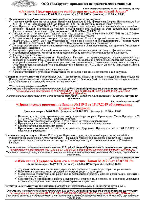 ООО «БелЭрудит» приглашает на практические семинары. Сентябрь