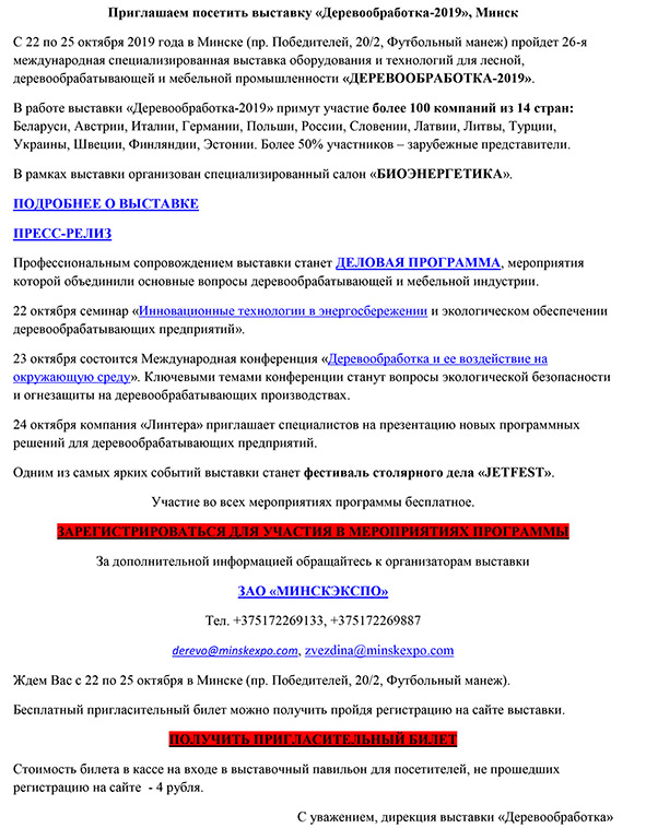 Приглашаем посетить выставку «Деревообработка-2019», Минск