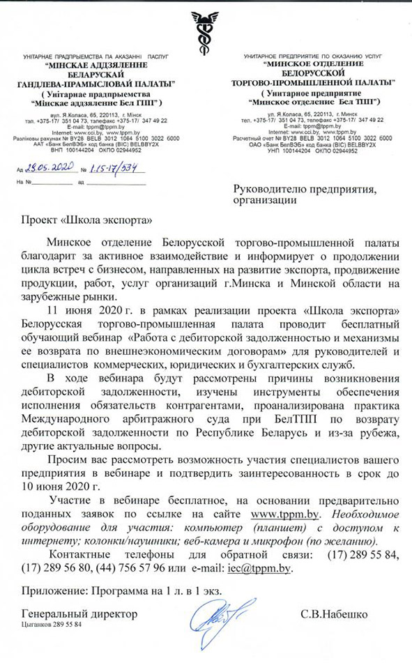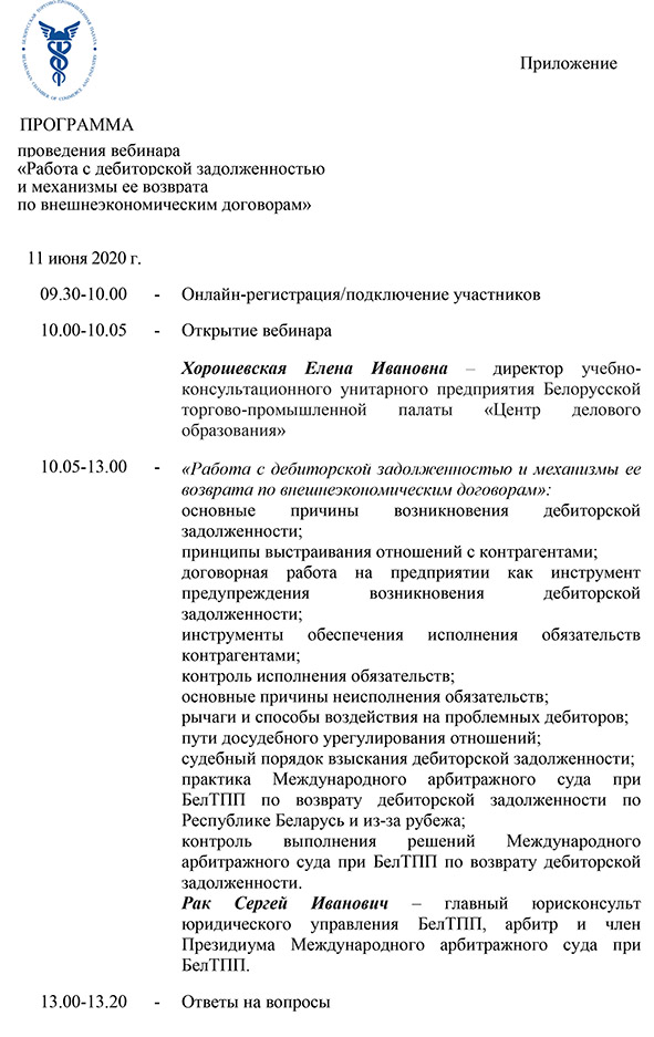 Вебинар. БелТПП. «Работа с дебиторской задолженностью и механизмы ее возврата по внешнеэкономическим договорам» (11.06.2020)