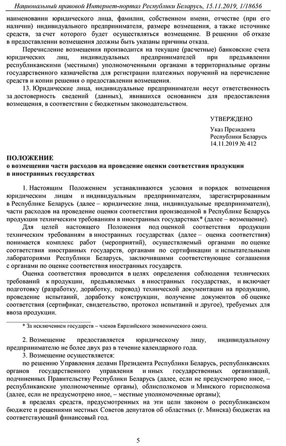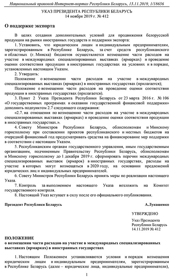 Указ от 14.11.2019 № 412 «О поддержке экспорта»