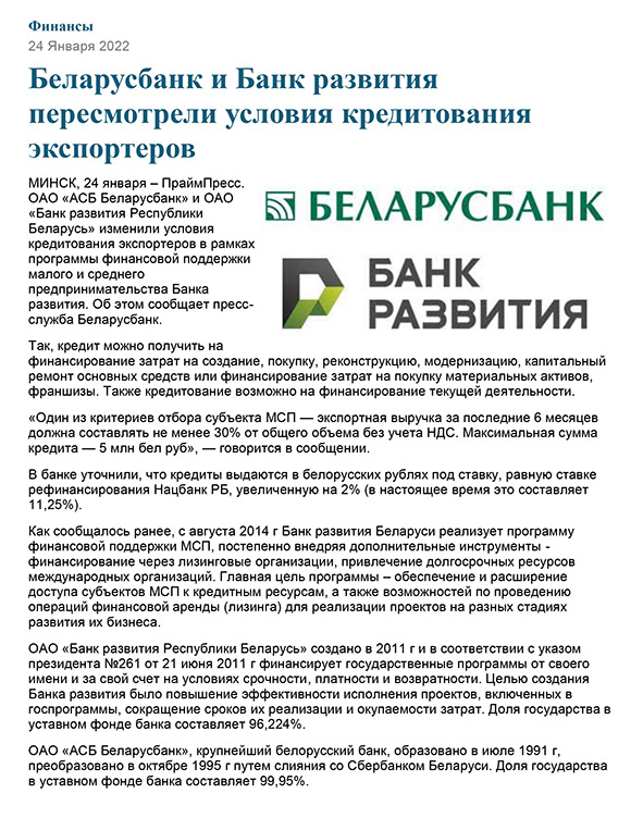 БЕЛАРУСбАНК И БАНК РАЗВИТИЯ О КРЕДИТОВАНИИ ЭКСПОРТЁРОВ
