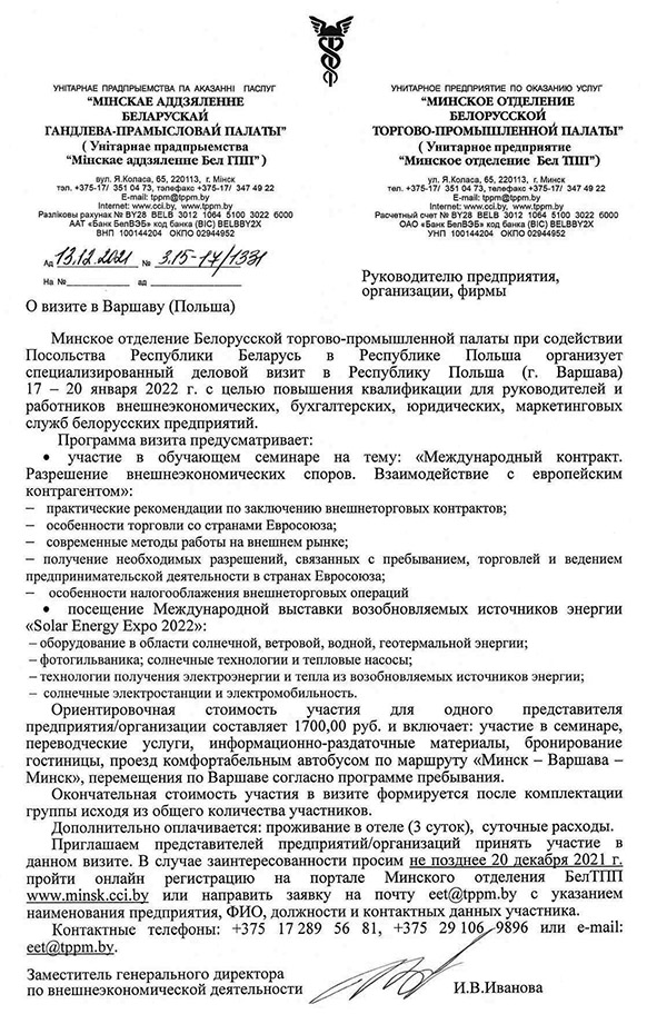 Об участии в специализированном визите в Варшаву (Польша) 17-20 января 2022 г.